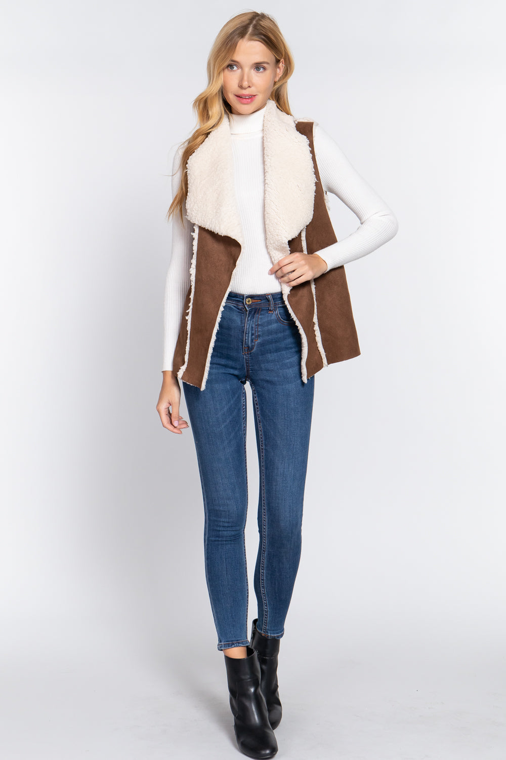 SHAWL COLLAR RAW EDGE DETAIL FAUX SUEDE FUR BONDED VEST