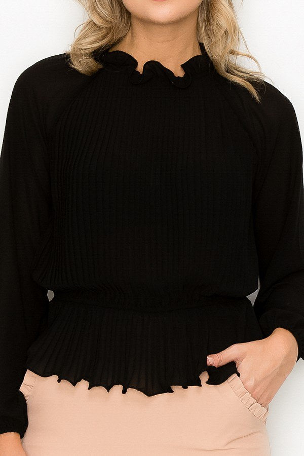 A woven top featuring a solid color, pleats, ruffles, a mock neckline, long sleeves, a peplum waist, and a back keyhole closure