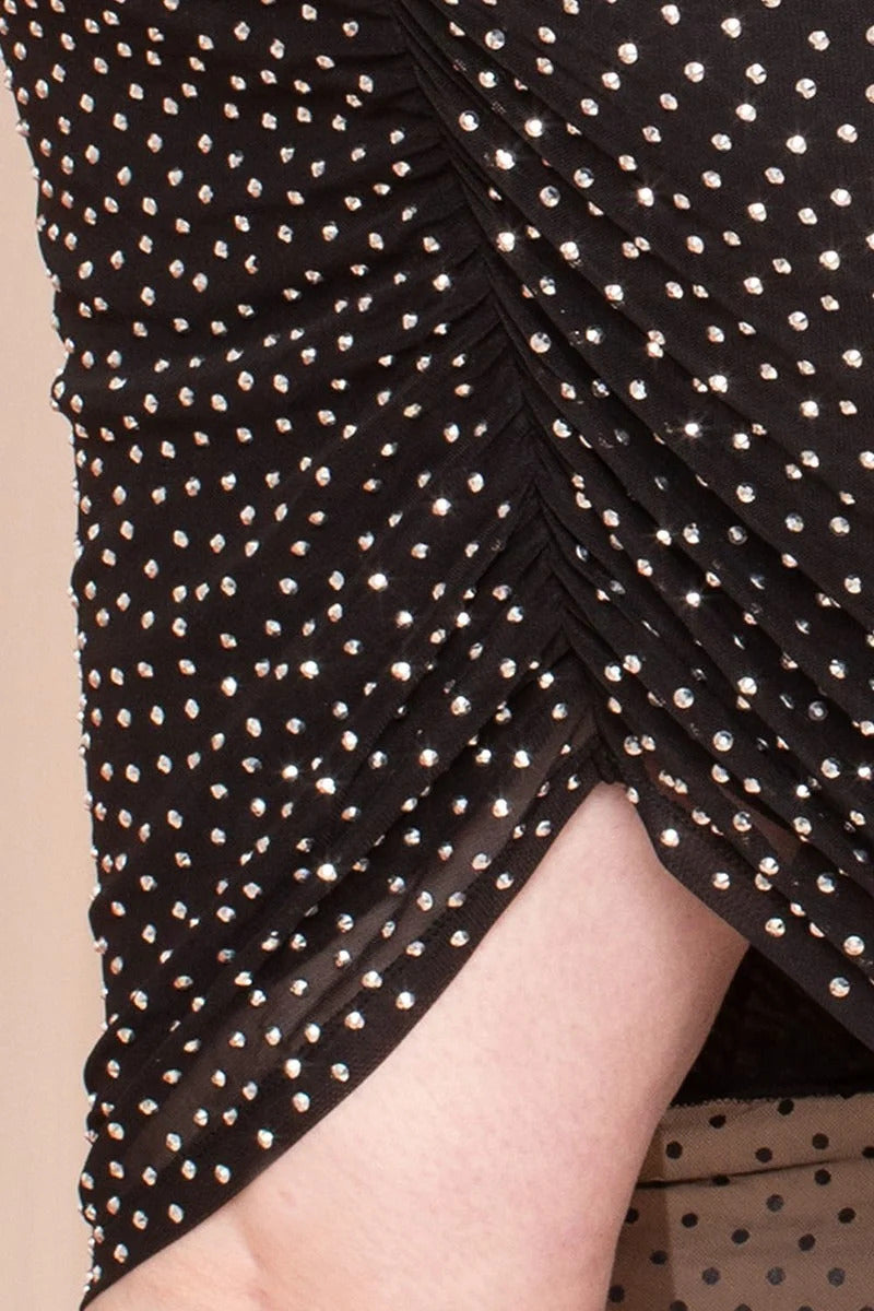 ROUND NECK. SHEER SLEEVE. V-SHAPE BACK. BACK SLIT HEM